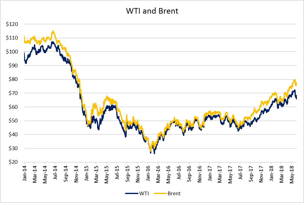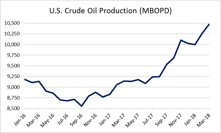 This rapid growth has helped separate domestic and international pricing, driving a widening wedge between WTI and Brent. Current forecasts predict this growth will continue through the year, with the EIA estimating total U.S. crude production will expand 14.6% in 2018 and 10.6% in 2019.