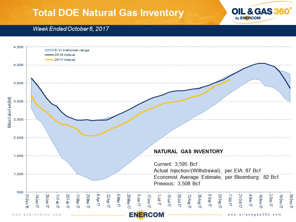 At 3.6 Tcf (week ending 10/6/17), natural gas storage was 0.2% below the five-year historical average, and 4.1% below the five-year high. The average spot price for Henry Hub in September 2017, was $2.98 per MMBtu, 2.8% higher than the previous month and 0.1% lower than in September of last year. The five-year strip at October 12, 2017 was $2.858 per MMBtu.