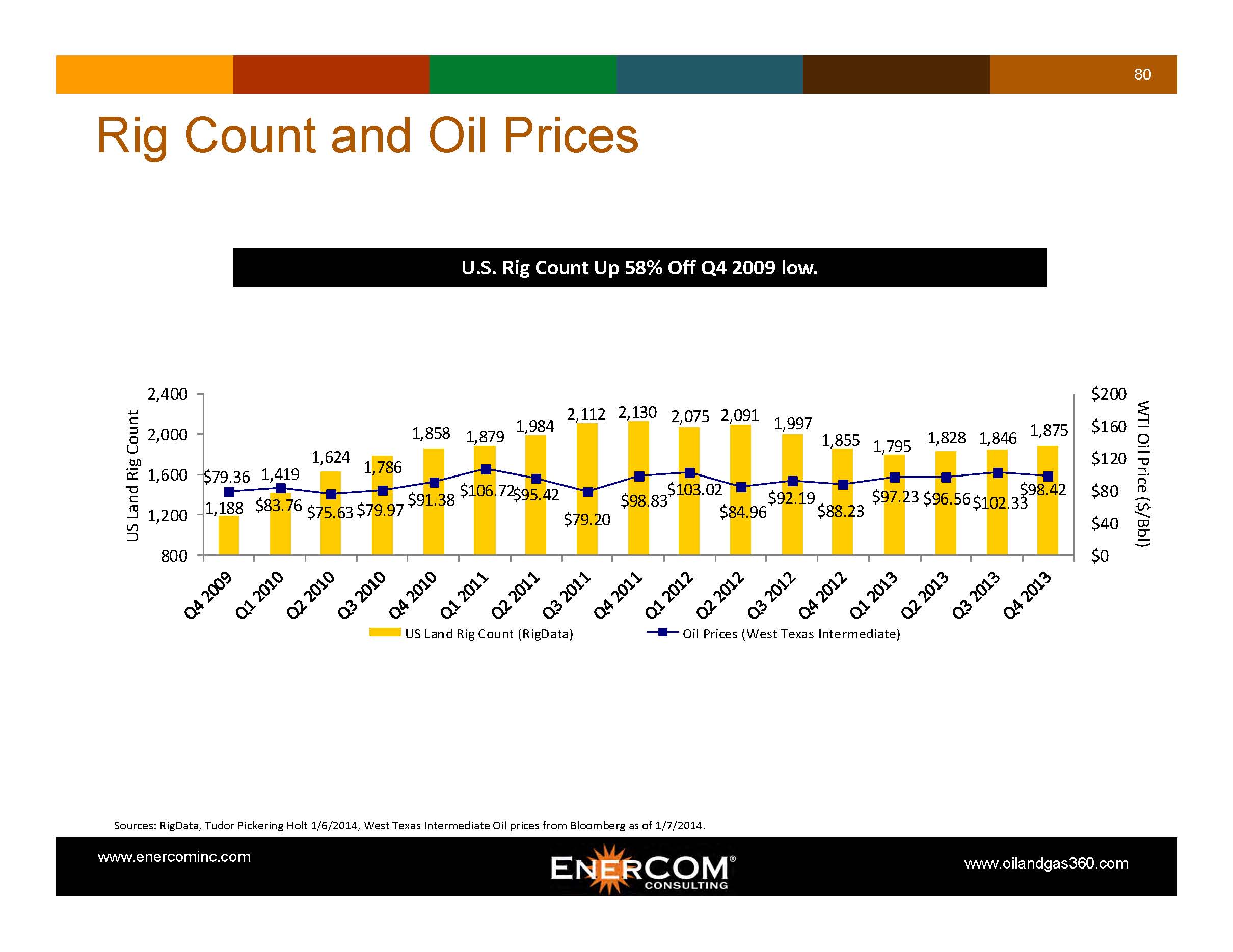 Rig Count. The U.S. land rig count sourced from RigData (page 80) on December 31, 2013, stood at 1,875 rigs, an increase of 29 rigs from Q3’13. On December 31, 2013, there were 1,169 horizontal rigs in the U.S., an increase from 1,119 in Q3’2013. On December 31, 2013, the number of horizontal rigs targeting natural gas exclusively dropped from December 31, 2011 by 188 rigs to 208 for a decline of 47%. The number of rigs targeting oil exclusively increased from December 31, 2011 by 69 rigs to 267 for an increase of 35%.