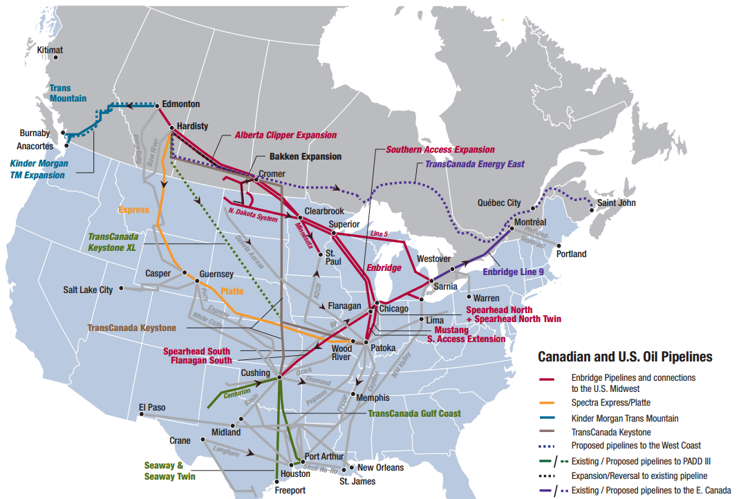 One of the most important planned pipeline expansions is the TransCanada Energy East. Canada generally lacks significant infrastructure to directly transport oil from the centers of production in Western Canada to the population centers in Eastern Canada. The proposed TransCanada Energy East would do much to solve this problem, as it would bring oil by Quebec City and Montreal, ending its route at Saint John. The pipeline has a planned capacity of 1.1 MMBOPD, and is targeting completion in 2021.
