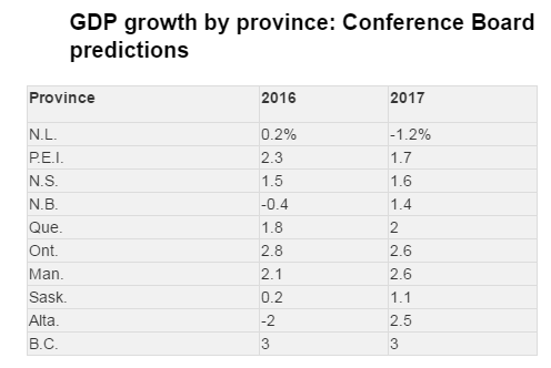 The Canadian economy is expected to grow over the next two years, but the growth of individual provinces will vary widely, according to a report from the Conference Board of Canada. British Columbia, Ontario, Manitoba and Prince Edward Island are expected have GDP growth rates of more than 2%, while more energy-dependent provinces will likely struggle.
