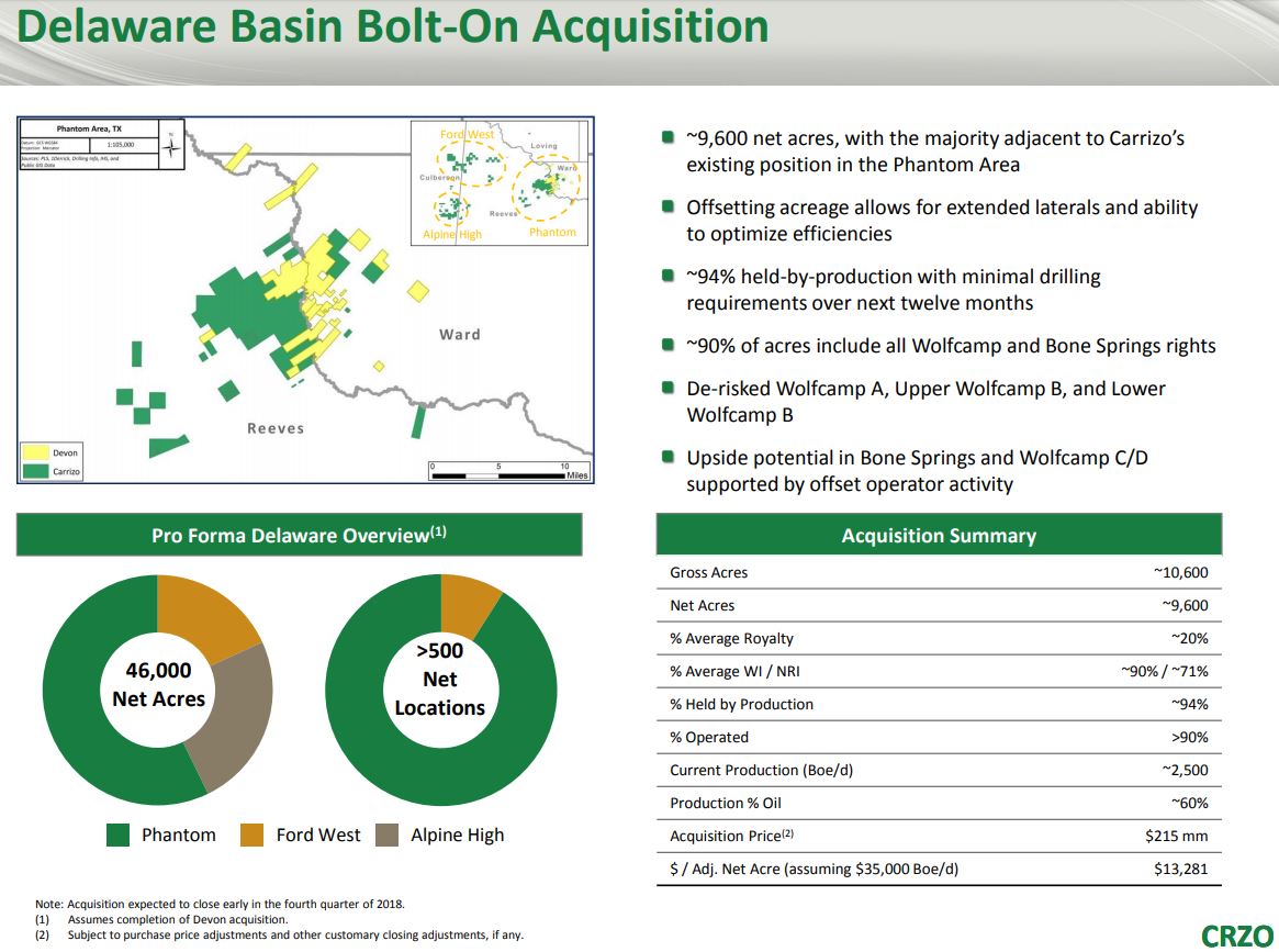 The acquisition and increases Carrizo’s acreage position in the Delaware Basin to approximately 46,000 net acres on a pro forma basis. The deal is expected to close in Q4 2018.