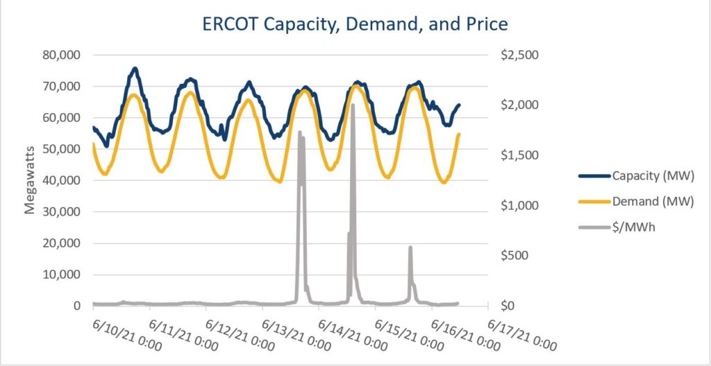 The Electric Reliability Council of Texas (ERCOT) is an independent system operator that manages the flow of electric power to Texans and represents about 90 percent of the state’s electric load. Over the past couple of days, a large heat wave caused demand to nearly reach capacity in the afternoons when it is hottest. The heatwave caused power plants to unexpectedly go down and required repairs causing demand to nearly reach capacity and forcing people to go without power. The plants that are down have a combined capacity of 12,200 megawatts which could run about 2.4 million homes. Officials are asking customers to try to conserve power throughout the day and only use it for necessities. An interesting note is the price cap for wholesale power is $2,000 per megawatt-hour which was reached in the afternoon of the 14th. This number could have been higher if it were not for the cap being lowered from $9,000 after Texas’ devastating winter storm in February 2021.