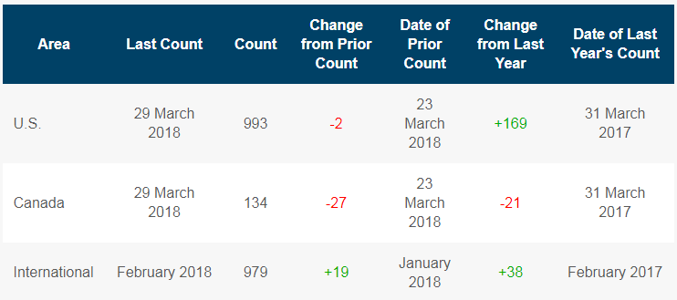 Directional drilling continued its decline this week, as two such rigs shut down. Directional activity has fallen by 20% in the month of March, from 75 rigs at the beginning of the month to the current level of 60 active rigs. A total of 870 horizontal rigs and 63 vertical rigs are currently drilling.