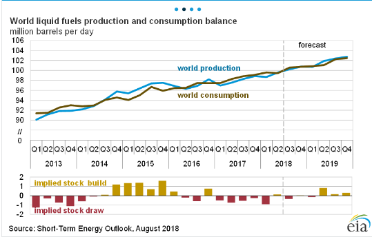 EIA forecasts total global liquid fuels inventories to decrease by 0.3 million b/d in 2018 compared with 2017, followed by an increase of 0.3 million b/d in 2019. This outlook of relatively stable inventory levels over the forecast period contributes to a forecast of monthly average Brent crude oil prices remaining relatively stable between $70/b and $73/b, from August 2018 through the end of 2019.