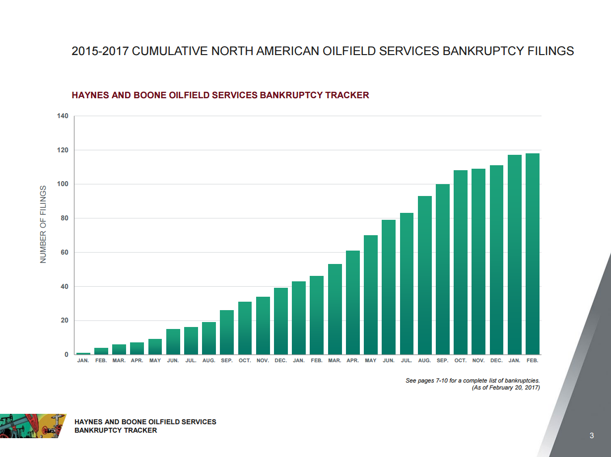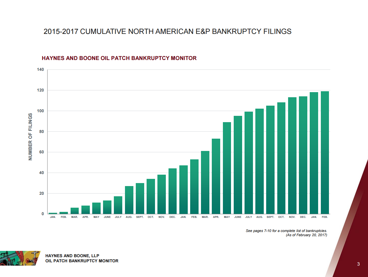 Five oil and gas companies have gone bankrupt in the first two months of this year, according to the most recent edition of Haynes and Boone’s Oil Patch Bankruptcy Monitor. Currently 119 E&P companies have entered bankruptcy since the beginning of 2015.