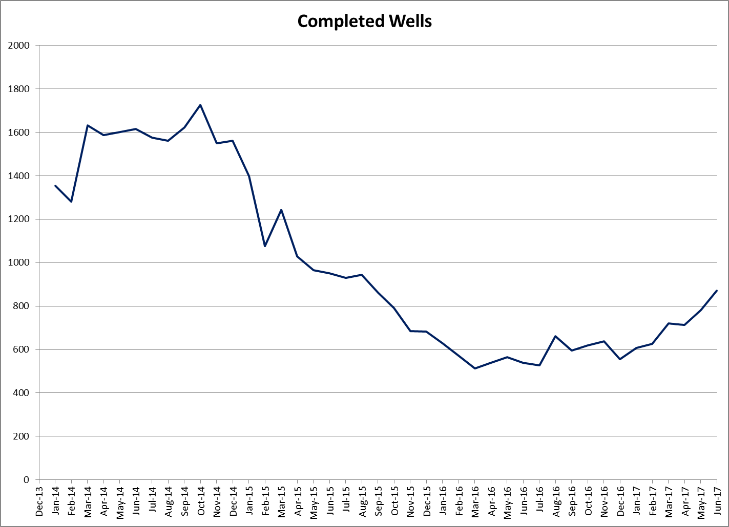 Increased activity has meant demand for sand is likely to break records in 2017, with 73 million tons of demand projected. More and more wells are being completed, according to the EIA. In 2016, an average of 590 wells were completed each month. In 2017, completions have been growing steadily, and 872 wells were completed in June.