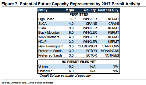 Unsurprisingly, much of the overall demand and demand growth has come from the Permian basin, which may grow by 600 MBOEPD this year. Historically, much of the sand used in fracturing operations has been mined in Wisconsin and Minnesota. However, operations in the Permian are driving large increases in Texan sand production capacity. According to Credit Suisse, 32 million tons per year of additional capacity could come online by the end of 2018 from Texas mines.