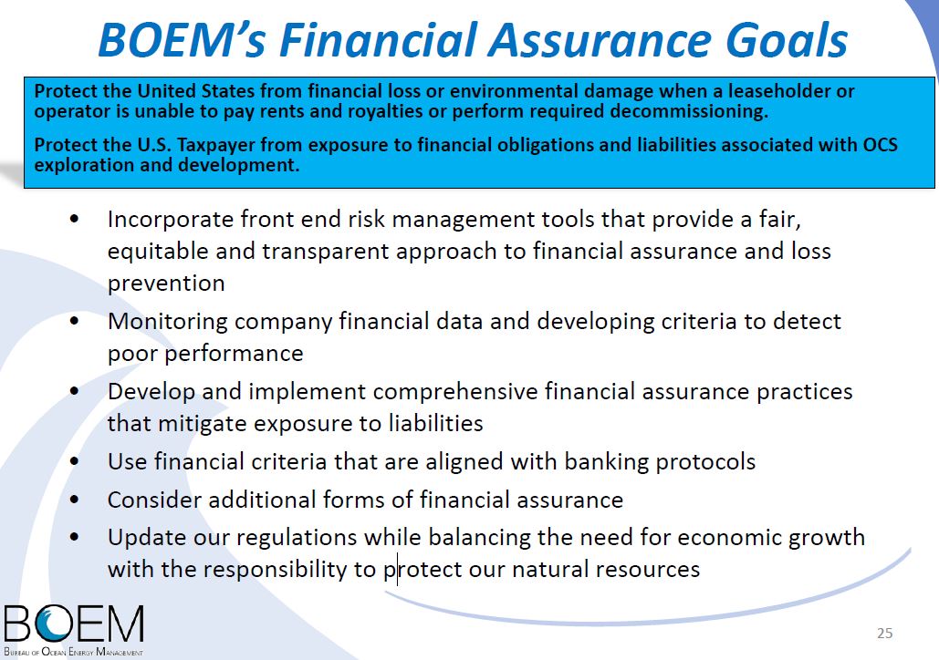 MC: If you go into the actual regulation, there is regional director discretion allowed in the regulation. There is some structure upfront to the NTL, especially around sole liabilities, so that’s the first thing that has to be provided for, but we would like the [joint] owners/operators to come in and look at a financial plan, a tailored plan approach. Under the tailored plan approach we have about a year to work out a solution for both BOEM and the operator.