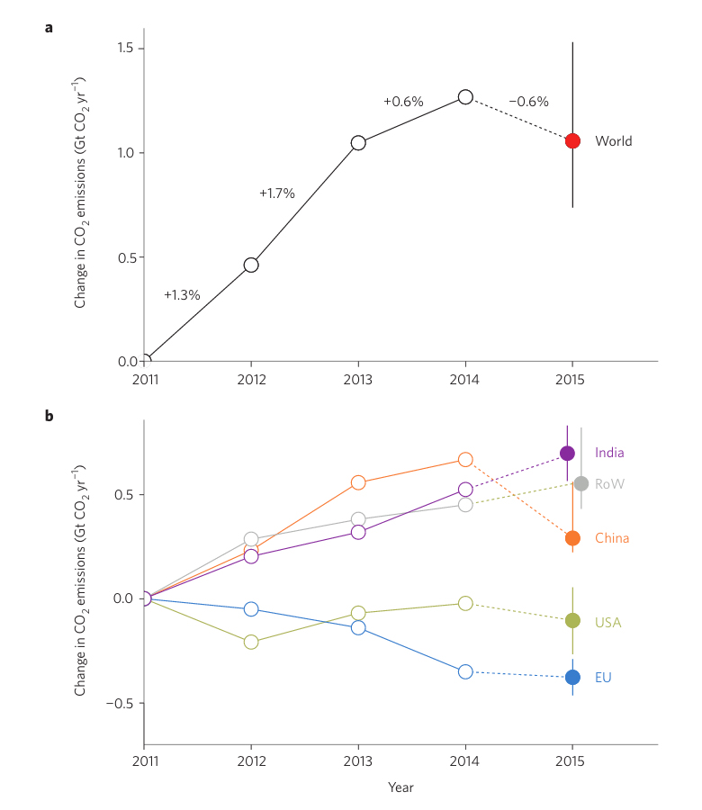 “We present new data for 2014 and a projection for 2015 indicating that the rapid growth in global CO2 emissions from fossil fuels and industry since 2000 slowed dramatically in the past two years despite continued global economic growth. Time will tell whether this surprising interruption in emissions growth is transitory or a first step towards emission stabilization.”