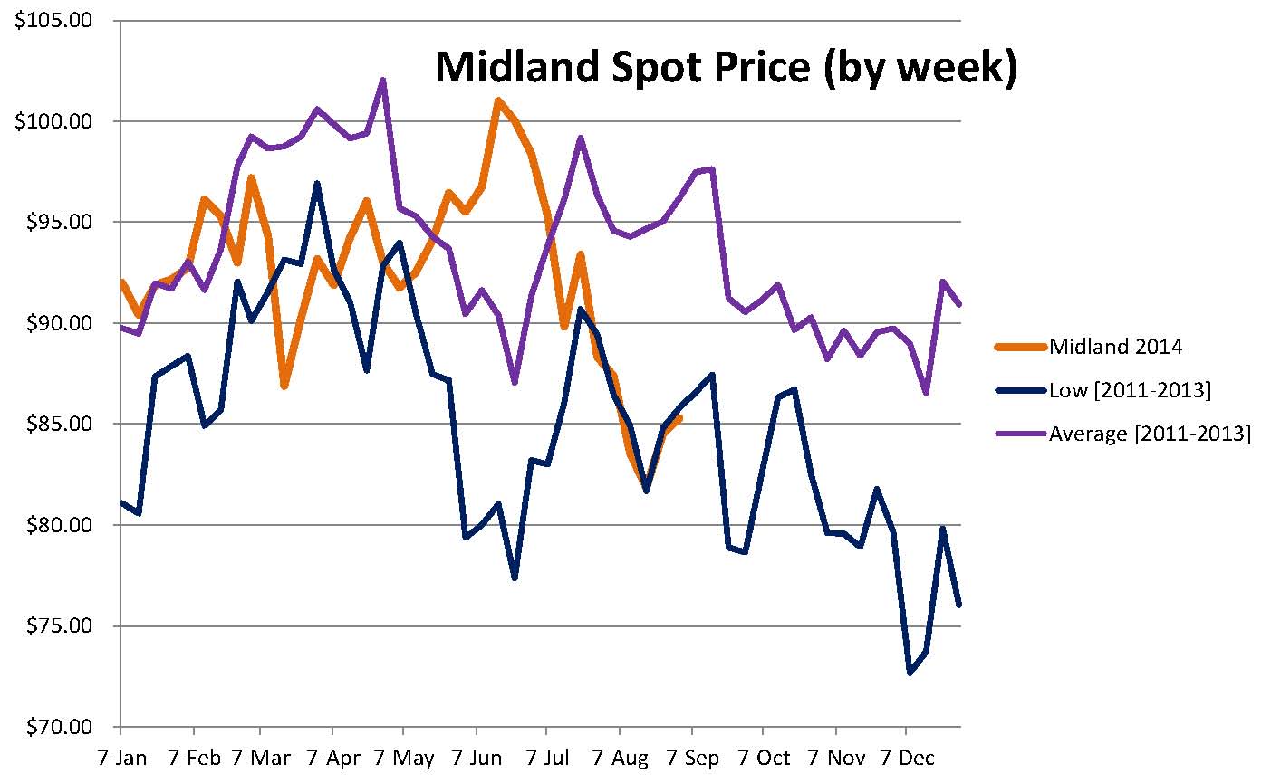 Spot prices at the Permian’s main hub in Midland, Texas, are trending among three-year lows. Its differential on August 25, 2014, was roughly $8 below the West Texas Intermediate (WTI) price and approximately $17 below the Brent spot price. The growing differential between the two chief spot prices has widened in the midst of growing supply in the United States and political unrest overseas.