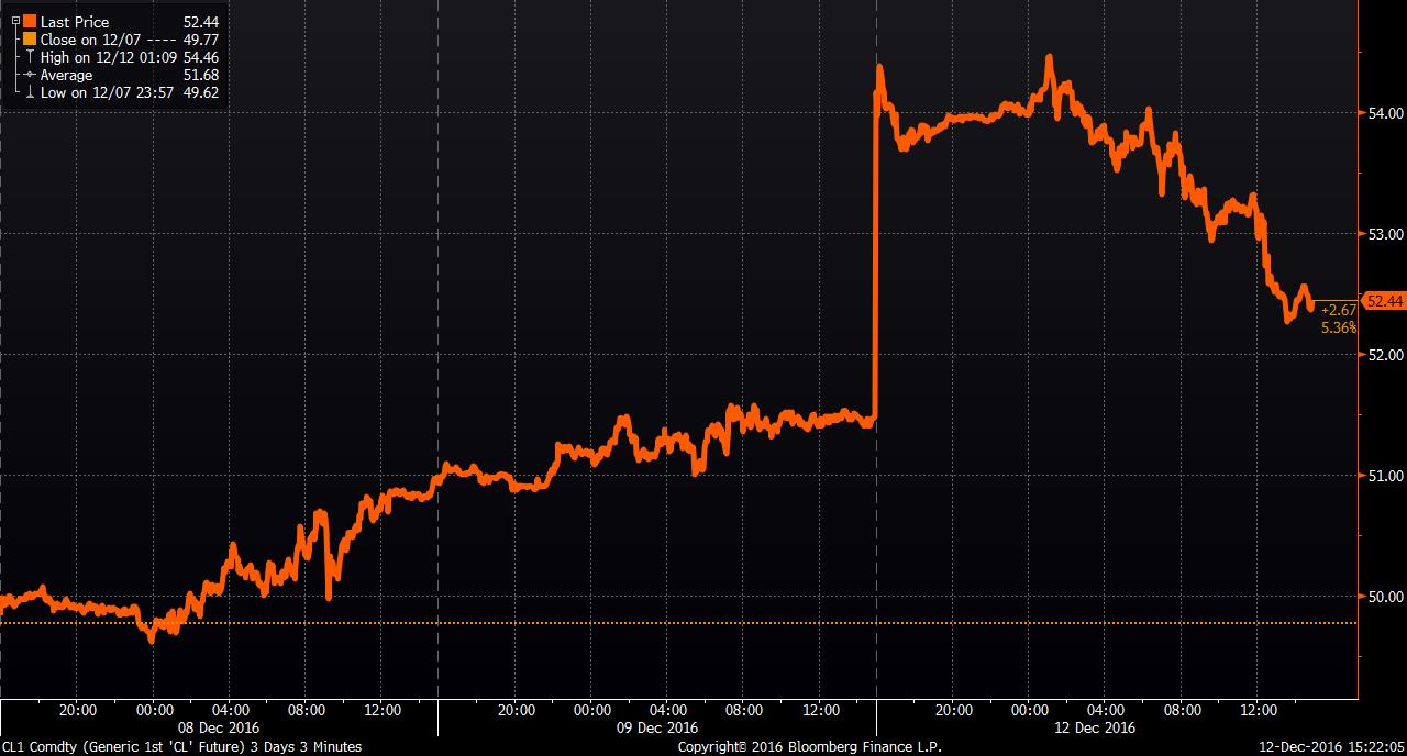 Oil prices traded lower throughout the course of Monday after spiking on news of non-OPEC cuts, but still closed higher than on Friday. U.S. crude oil benchmark WTI closed up 1.8% for the day at $52.44 per barrel while international crude oil benchmark Brent ended the day 1.9% higher at $55.36 per barrel.