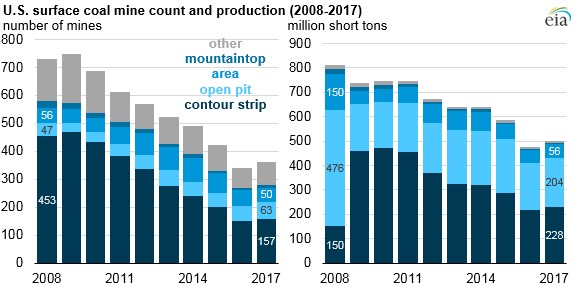 Open-pit coal mining is a combination of contour and area mining methods and is used to mine thick, steeply inclined coalbeds. In contrast to other forms of mining, open pit mines increased in number from 2008 to 2017, but production levels still fell.