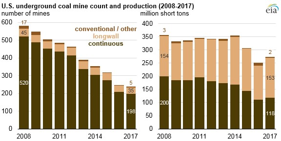 In the United States, decreasing demand for coal has contributed to lower coal production, which has fallen by more than one-third since peak production in 2008. As U.S. coal demand has declined, the number of active coal mines has decreased by more than half, from 1,435 mines in 2008 to 671 mines in 2017. As the U.S. market contracted, smaller, less efficient mines were the first to close, and most of the mine closures were in the Appalachian region.