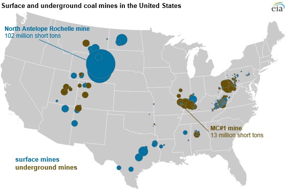 Two stories below patch together the story of coal: Wyoming’s Cloud Peak Energy, EIA current count of coal mines in the U.S. and their production