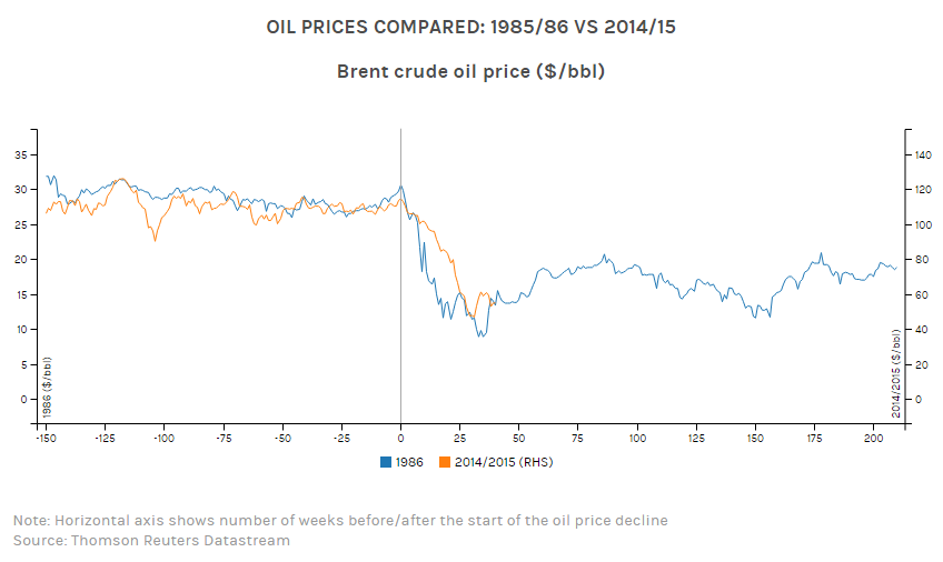 - In 1986, the nominal price of crude dropped below $15/barrel when Saudi Arabia opened the taps to an average of 5,246 MBOPD from 3,778 MBOPD in 1985. The chief member of OPEC is producing at all-time highs in the current environment, defying pleas from other cartel members to cut production. Global supply in 2014 was 93,097 MBOPD – 51% above 1986’s volume of 61,533 MBOPD.