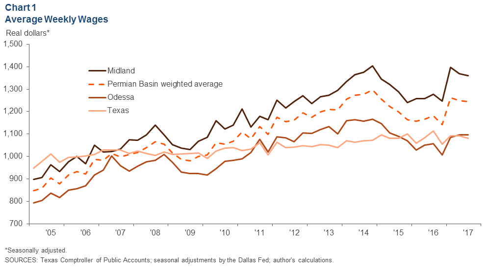 The average weekly wage in the Permian during third quarter 2017 was over $1,200—about 15% more than the Texas average. This is likely because of the larger share of energy jobs in this area relative to the state’s job market, the Fed said.