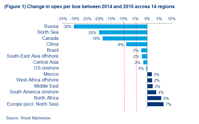 Russia has reduced opex by 30%, far exceeding the average. If it is removed from the dataset, the average global reduction in opex is just 4%, and it still varies greatly by region. Canada has reduced opex by 18%, while Wood Mackenzie has U.S. onshore opex unchanged between 2014 and 2015.