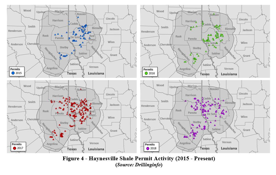 Figure 4 shows drilling permit activity for 2015 to present year. In terms of activity, Northwestern Louisiana historically has been the “sweet spot”; however, increasing permits in East Texas is being seen in 2018. Industry participants have delineated a North Louisiana Core (apparent in Figure 2 heat map) in Caddo, DeSoto, Bienville and Red River Parishes, Louisiana with a higher percent weight of total organic content (TOC), higher average total porosity and higher original gas in place (OGIP).