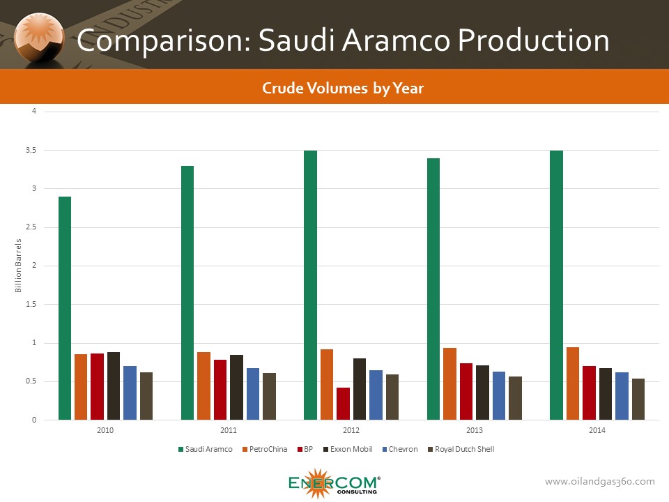 Analysts are torn on the market value of Aramco, but, as evidenced by Oil & Gas 360®’s Chart of the Week, when you look at the company’s oil production, it dwarfs that of the “other” major producers and its listed reserves are more than 12 times greater than those of Exxon Mobil Corp. (ticker: XOM), its closest Western oil company competitor in terms of size.