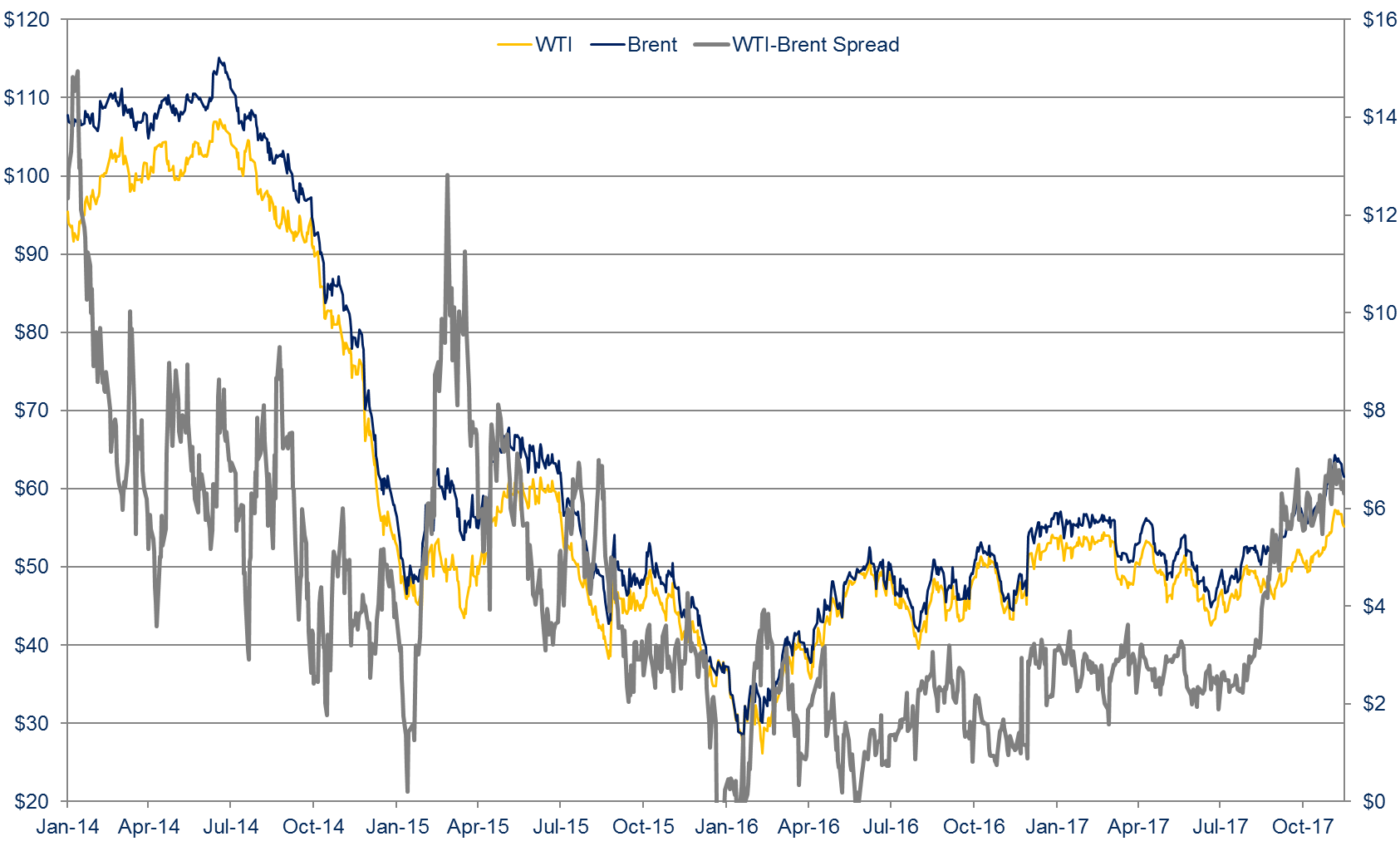 WTI is currently trading at $55.21/bbl while Brent is at $61.50/bbl, a spread of $6.29/bbl. This spread is lower than the $6.99 reached at the end of October, but is still significantly higher than the average of $2.17 between October 2015 and July 2017.