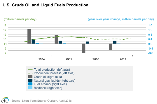 The EIA also lowered its expectations for average U.S. production over the next two years this week, forecasting an average of 8.6 MMBOPD this year and 8.0 MMBOPD in 2017. Both were 0.1 MMBOPD lower than the EIA’s previous prediction. The EIA’s estimates showed production fell 90 MBOPD in March alone.