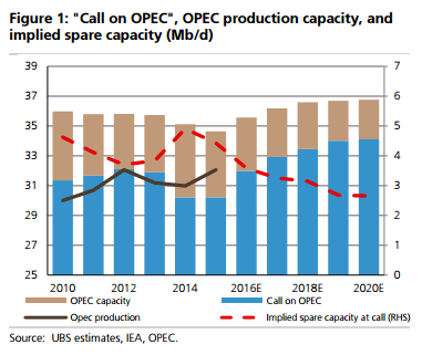 “We believe that any agreement to freeze output which excludes Iran would largely be an acknowledgement of existing conditions at the main participants,” said UBS. “Current spare capacity is confined mainly to Saudi, and we believe that the prospects for capacity growth elsewhere within OPEC are limited.”