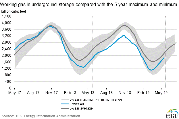 Working gas in storage was 1,867 Bcf as of Friday, May 24, 2019, according to EIA estimates. This represents a net increase of 114 Bcf from the previous week. Stocks were 156 Bcf higher than last year at this time and 257 Bcf below the five-year average of 2,124 Bcf.