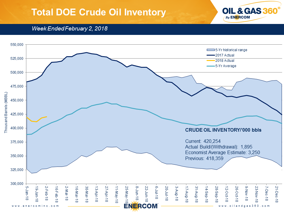 Crude oil stocks rose by 1,895 MBBL last week to 420,254 MBBL, from 418,359 MBBL. This is 17% below the 508,592 MBBL that was in storage at this point last year, and is 4% above the five-year average. This week’s storage build was somewhat below expectations, as the average analyst prediction called for a build of 3,250 MBBL.