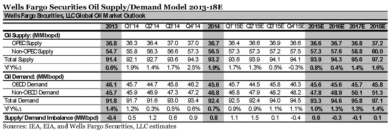 The oncoming projects, if they are indeed constructed, will still have no problem finding customers. The firm expects global demand to continue to grow through at least 2018. In the near term, Wells Fargo believes demand will outweigh supply by Q4’15, but the scales will tip in favor of supply by 2018 as shale development recovers and large-scale projects come online. The disparity will not be as great as 2014 however – Wells Fargo estimates we exited 2014 with 0.8 MMBOPD of excess supply.