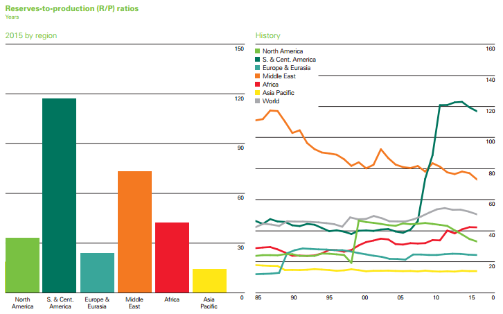 Global proved oil reserves in 2015 were 1,697.6 billion barrels. That number represents a 24% increase over the last decade, and is enough to meet 50.7 years of global production, BP said in its report.