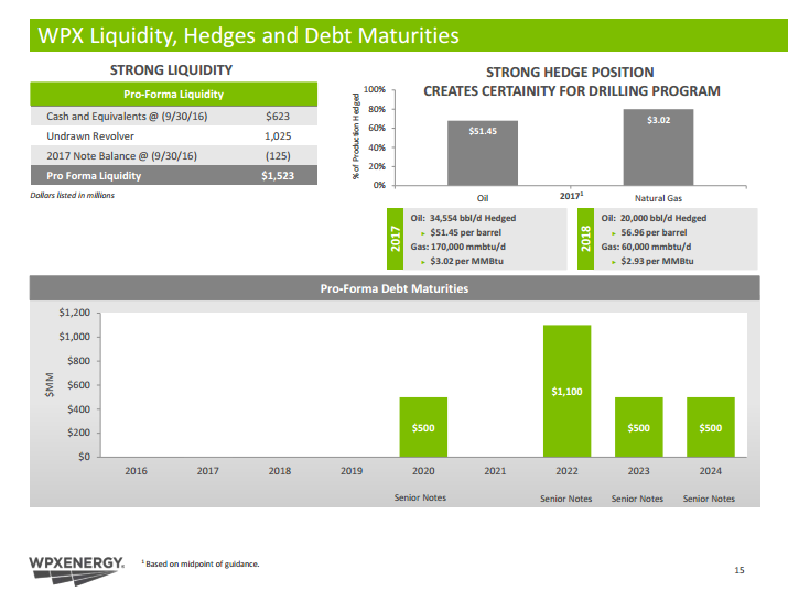 This plan is supported by the company’s strong financial position, which includes 1.03 billion on an undrawn revolver and cash and equivalents of $623 million. After taking into consideration the company’s 2017 notes, WPX has more than $1.5 billion in liquidity at its disposal to drill in the hottest oil play in the U.S. right now.