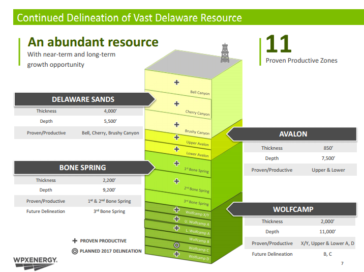WPX has amassed more than 100,000 net acres in the Delaware with more than 5,500 gross drillable locations across stacked pay, which the company says will offer decades of drilling opportunities. The company plans to delineate the Wolfcamp C bench of its acreage in 2017, and test 330 foot spacing and 56% longer laterals in the Wolfcamps A and X/Y, the company said in its presentation.